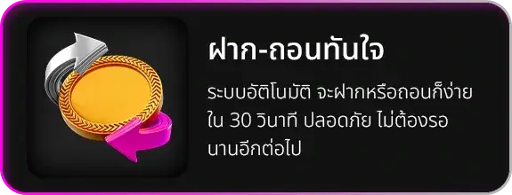 โดดเด่นด้วยระบบฝาก-ถอนออโต้ที่ทำงานร่วมกับธนาคารชั้นนำและระบบ E-Wallet ทั่วประเทศ ช่วยลดระยะเวลาในการรอคอยและลดข้อผิดพลาดจากเจ้าหน้าที่ ทำให้ผู้เล่นสามารถบริหารจัดการเงินทุนได้อย่างอิสระตลอด 24 ชั่วโมง
